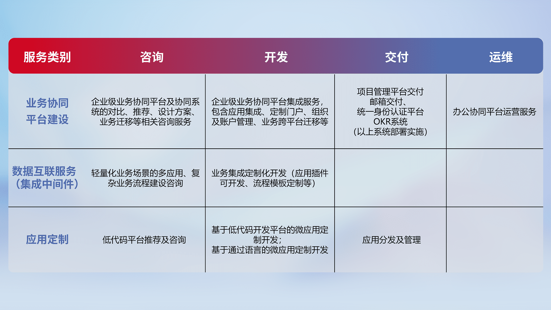 针对钉钉、、、企微、、IDaas等平台级产品提供产品的规划、、、、方案、、、交付、、、定制化开发等服务,,实现如统一协同办公、、智能客户服务、、、混合会议管理、、、智能数据查询、、、等业务场景,,实现数字化转型。。